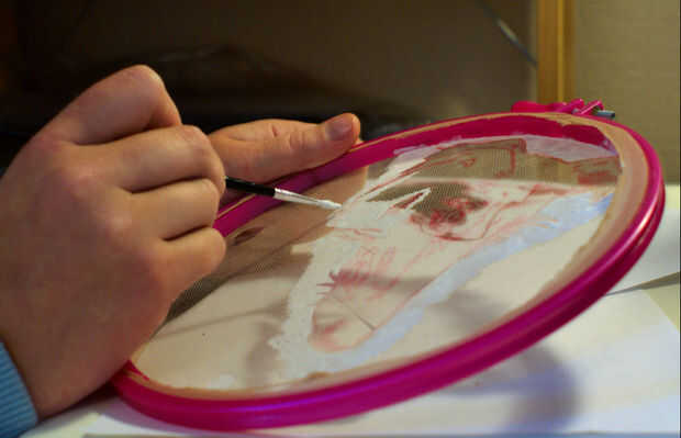 Es importante garantizar que el material de la pantalla no toca la superficie en la que trabajas, de lo contrario acabarás pegando la pantalla a la superficie! Usted puede cambiar a un cepillo más fino para pintar líneas finas y partes detalladas de la imagen y use un cepillo más grueso para aplicar pegamento a áreas más grandes de la pantalla, incluyendo un borde de 1-2 pulgadas fuera del contorno de la imagen.