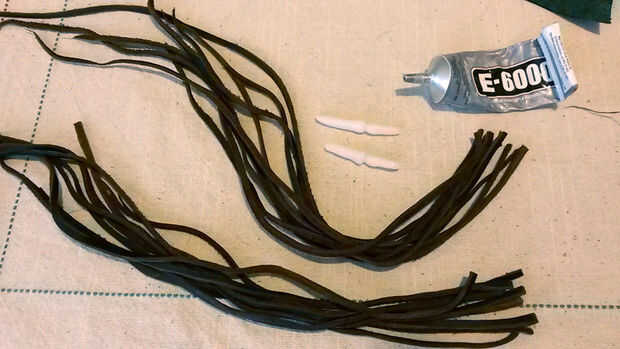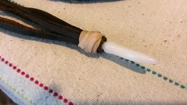 Aplique E6000 a un lado de la primera clavija y pegue cada tira de cuero en la clavija para que la parte atractiva es hacia fuera (si hay un lado atractivo).