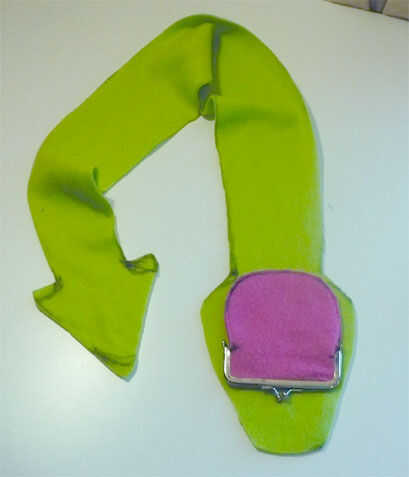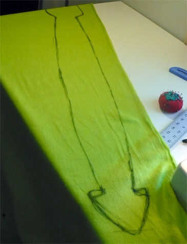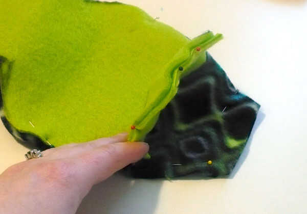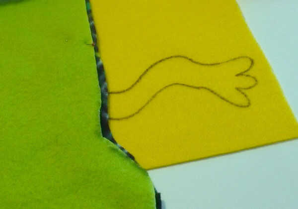 Una vez has diseñado la cabeza, seguir su línea para hacer que el cuerpo (hice mi bufanda unos 45" de largo). Agregar un diseño de la cola si desea y cortar la pieza. Utilice este recorte como una plantilla y pin/corte su 3er color de paño grueso y suave para el resto del cuerpo (derecho lados juntos). Marca donde el bolsillo se pondrán a la cabeza con una línea recta - esta va a ser la bisagra de la mandíbula de' y no será coser más allá de este punto.