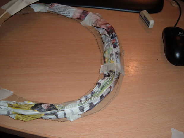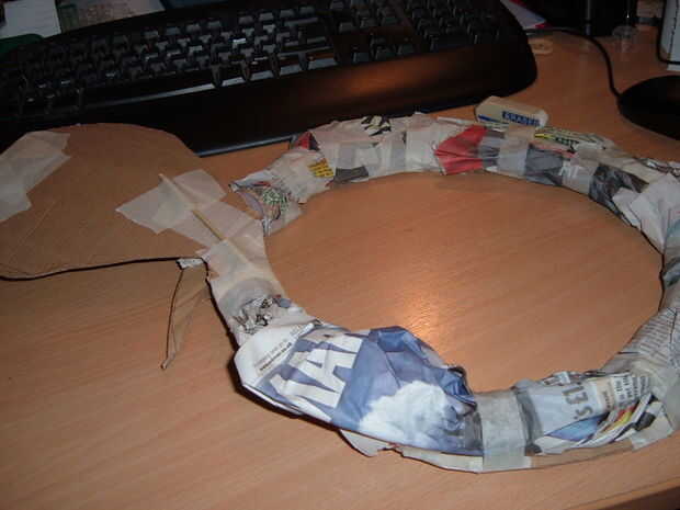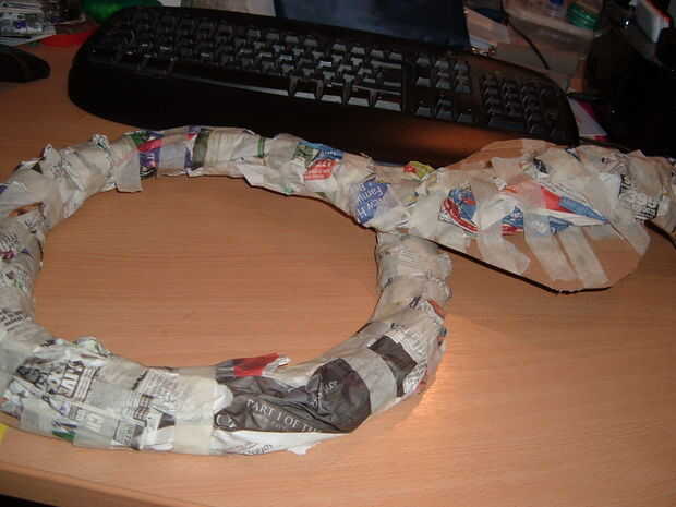 Con la forma básica ya preparada, necesita que el cuerpo parezca un cuerpo, en lugar de un montón de tarjetas floppy. Esto se hace colocando periódico con cinta de enmascarar. Atornille el periódico en tiras largas, pelotas y cualquier otra forma parece apropiado. Coloque esto en el contorno de la serpiente, para dar un tamaño decente. Deberás utilizar algún juicio en este paso y por el ojo para ver cuánto relleno parece razonable en relación con el tamaño total.