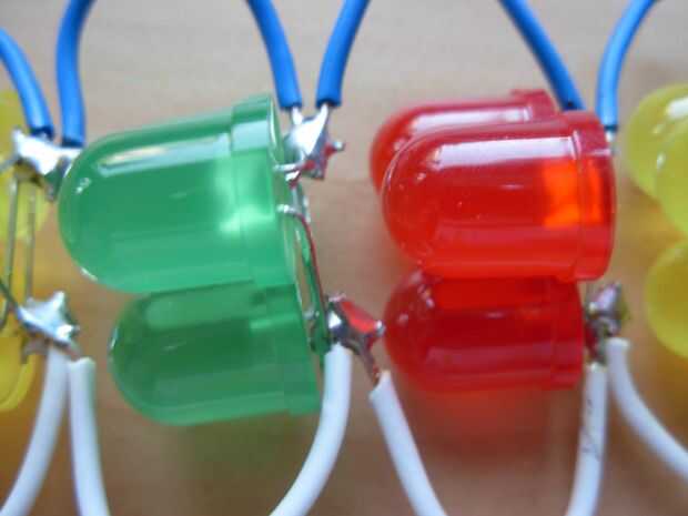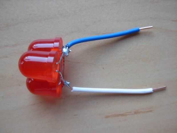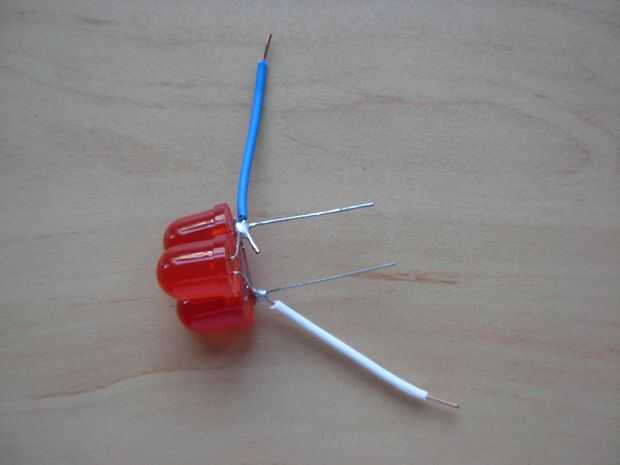 Poner los cables en los pines del LED y soldarlos, utilicé la pieza blanca para el pin positive(longer) el la pieza azul para el pin de negative(shorter) (cuadro 7). Ahora todo lo que queda es recortar las patillas y debe conseguir algo que se ven como en la imagen 8.