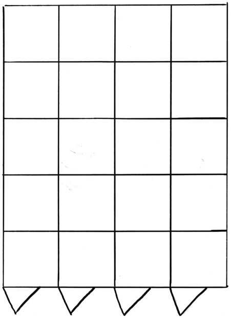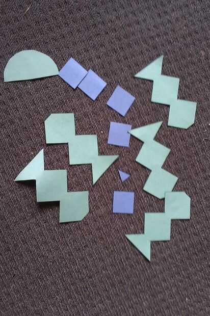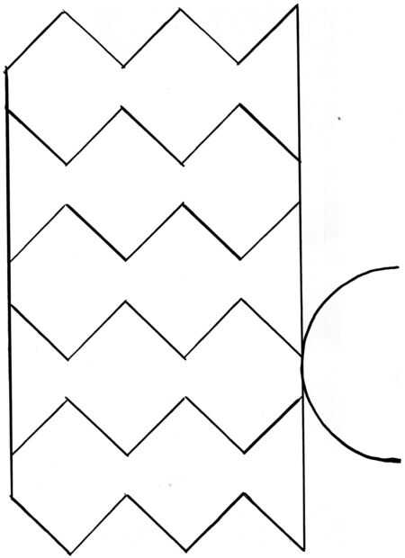 Corte la plantilla. He diseñarlo para que los estudiantes a cada necesidad una de la plantilla del cuerpo (un zig-zag), pero la plantilla de decoración (las plazas), pueden ser compartidos entre 4 estudiantes. El cuerpo y la decoración deben estar en colores diferentes de papel. Los estudiantes deben terminar con 5 plazas y un pequeño triángulo de un color y 5 zig-zags y un semicírculo de otro color.