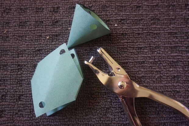 Con un sacador de agujero, poner agujeros en los extremos de las secciones y la parte ancha del cono. Asegúrese de que tiene un extremo de gratis un diamante. Esta será la cara de serpientes.