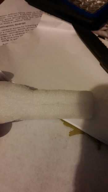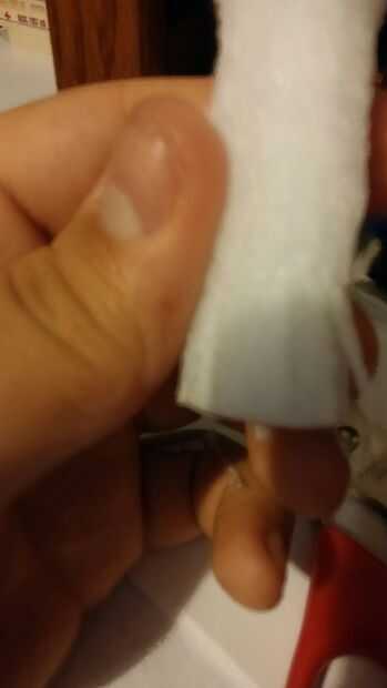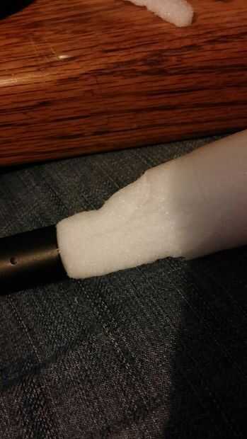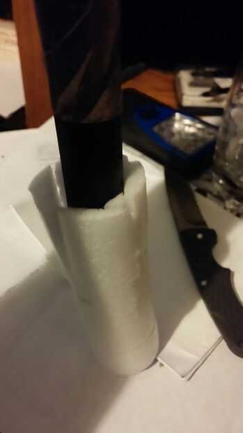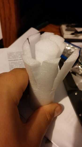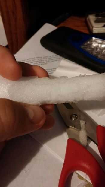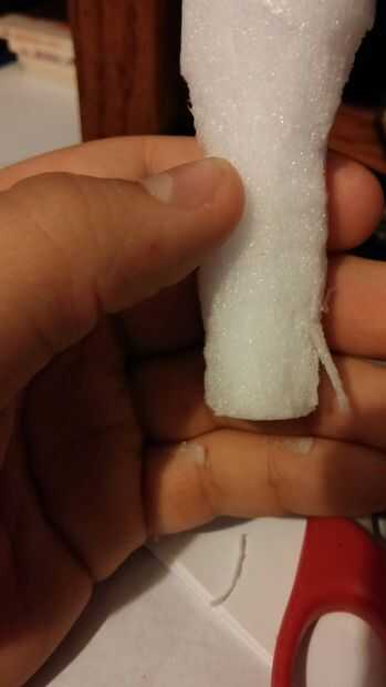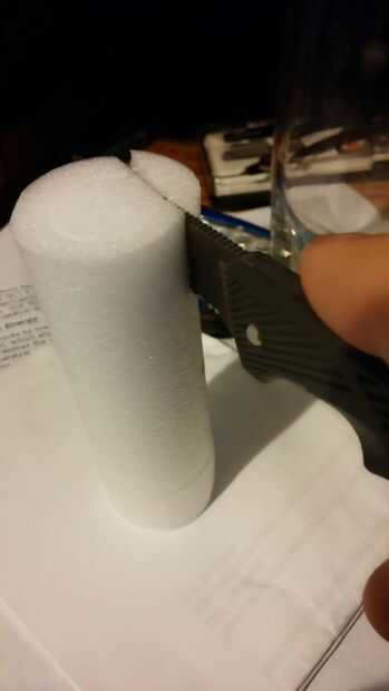 Luego, use un par de tijeras para cortar en las esquinas del cilindro hasta que el cañón quede sobre él. La espuma tiene aspecto shaggy, pero eso es aceptable. Mantenga su forma hacia abajo el cilindro de trabajo hasta que el cañón se deslizan sobre todo.