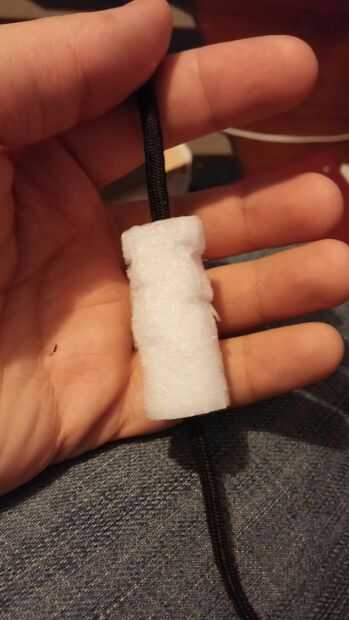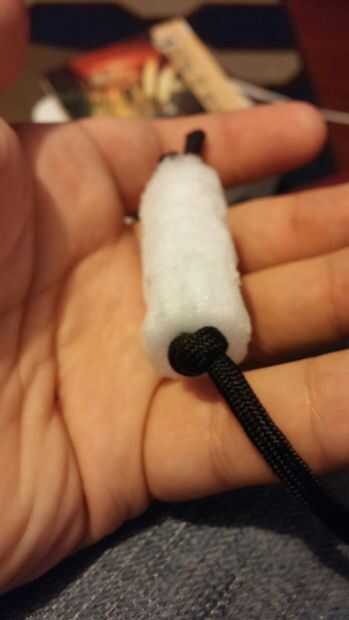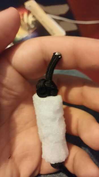 Pone suavemente Paracord a través del agujero en la espuma hasta que pase al final. Un gran nudo en el extremo y deslice la espuma a él. Entonces, un nudo pequeño sobre la espuma. Esto completa la serpiente.
