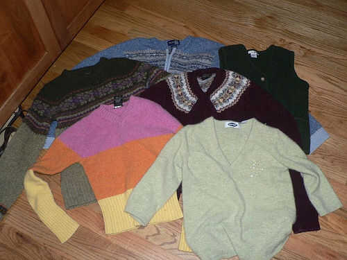 Lave todos los suéteres en agua caliente con un poco de jabón y secar en la secadora (desde suéteres diferentes encogen a diferentes ritmos, echa sobre ellas mientras que todavía húmedo y si alguno están reduciendo significativamente más los demás, sacar estirar y secar al aire). No tiene sentido perfectamente para este proyecto, ya que estarás stiching que verlos, pero ayudará si se sentían bien.