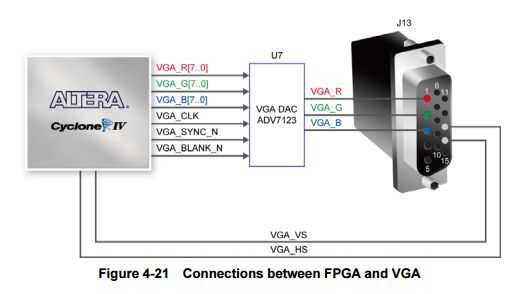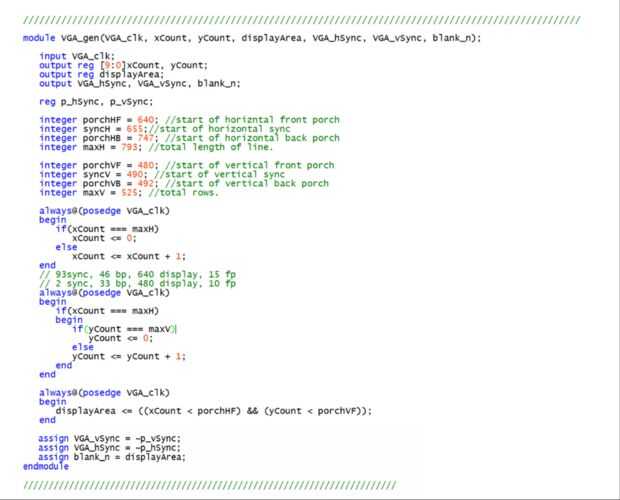 5. al concluir el módulo generador VGA, utilizamos tres declaraciones de asignación, dos de los cuales fueron asignados "VGA_vSync y VGA_hSync, como el inverso de la sincronización vertical y sincronismo horizontal. Nuestro final asignar declaración incluida con el área de pantalla definimos en nuestra asignación anterior y usando "blank_n" para definir nuestra área de exhibición.