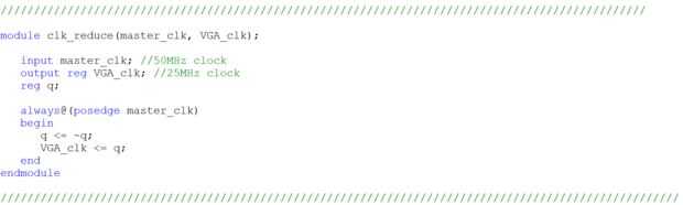 6. también en cuenta que el VGA no se puede ejecutar en una señal de reloj de 50MHz como fuentes de la Junta, por el contrario, funciona con un reloj de 25MHz. Utilizamos un módulo independiente (fotografiado) para reducir el reloj de 50MHz a 25MHz.