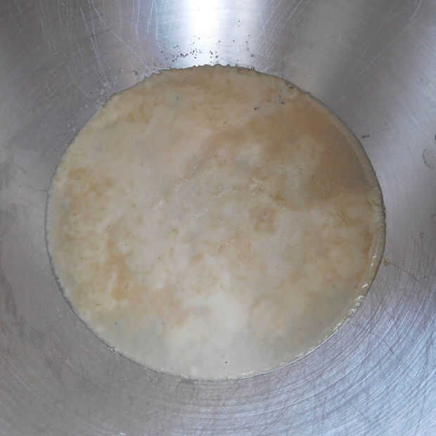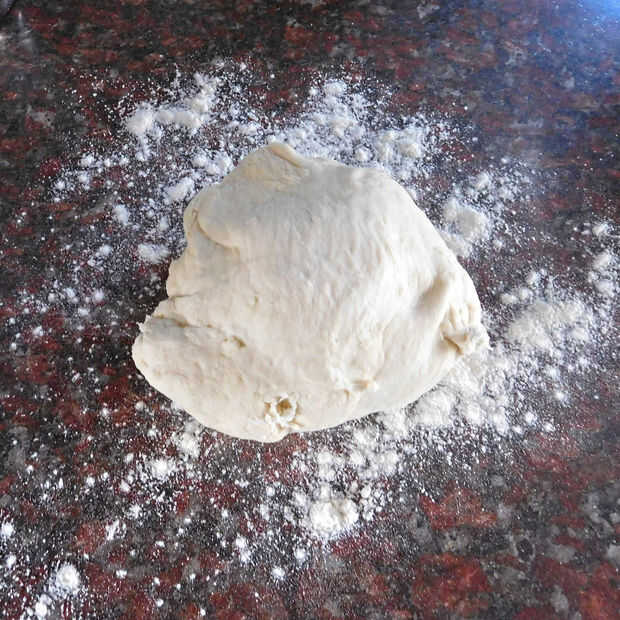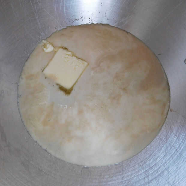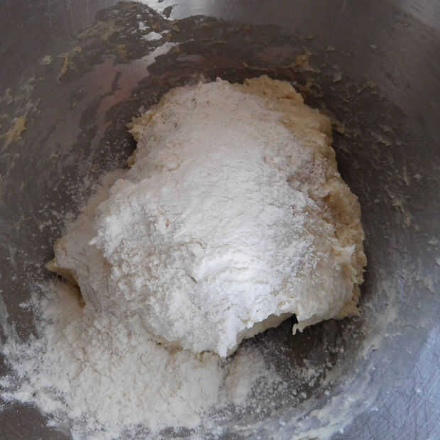 Añada la mantequilla y 2 tazas harina. Mezclar a velocidad baja hasta que la masa empiece a venir juntos. Añadir el restante 1/3 taza de harina y la sal y mezclar otra vez. Agregar más harina 1 cucharada a la vez hasta que la masa es pegajosa pero no pegajosa. Retire del bowl y amasar a mano (con más harina Si es necesario) de 3 a 5 minutos.