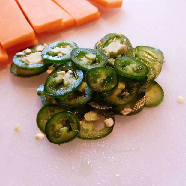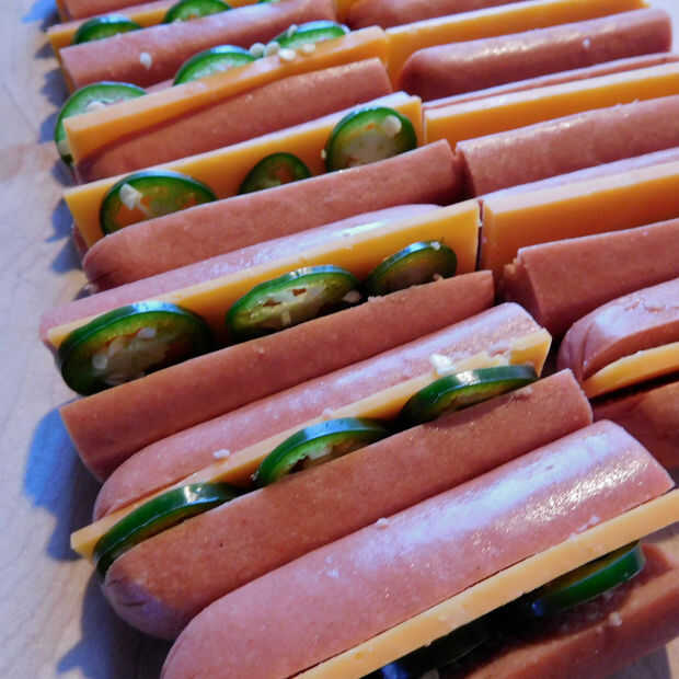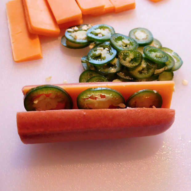 6. Colocar una loncha de queso y tres lonchas de serrano en 8 de los perros calientes. (Hacer 8 con serranos y 8 sin.)