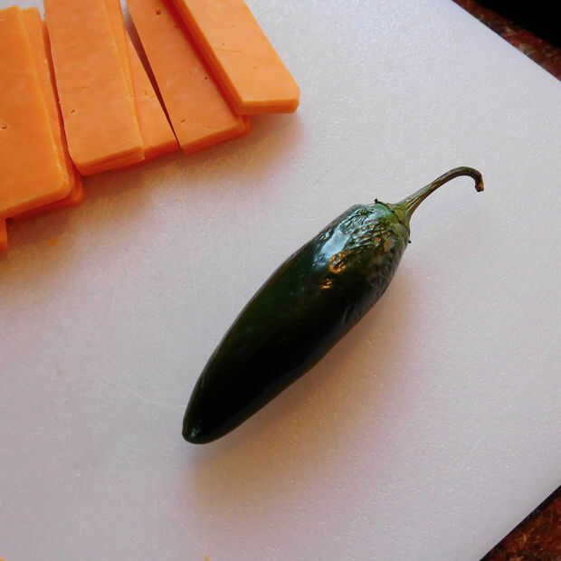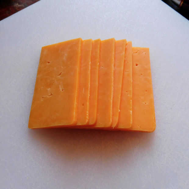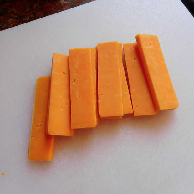 4. Cortar rebanadas de queso cheddar queso (gato pimienta sería buena también!) casi del mismo tamaño como su perrito caliente.