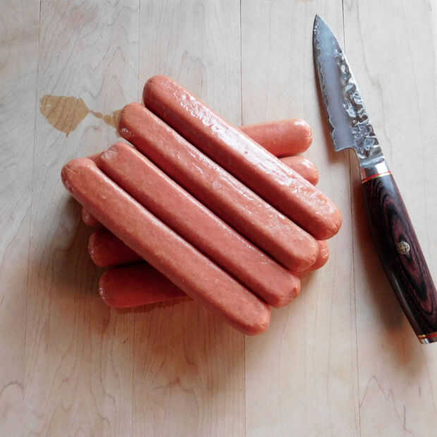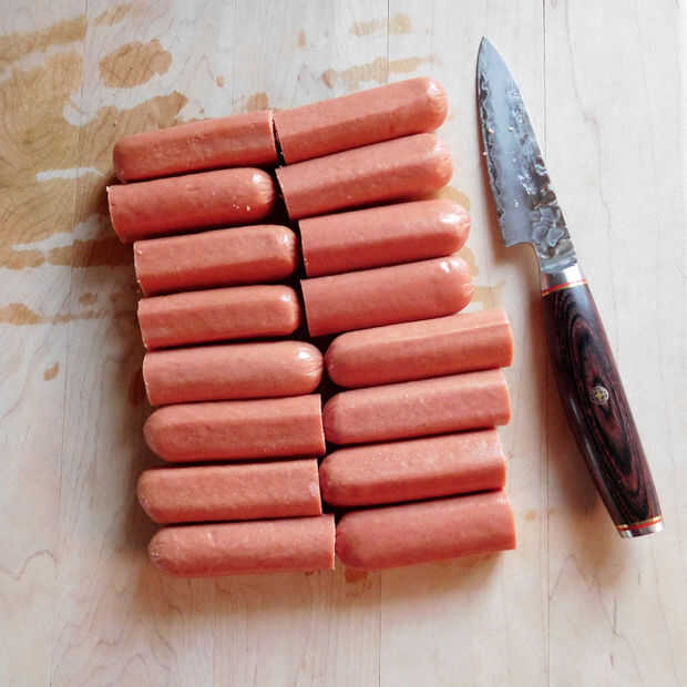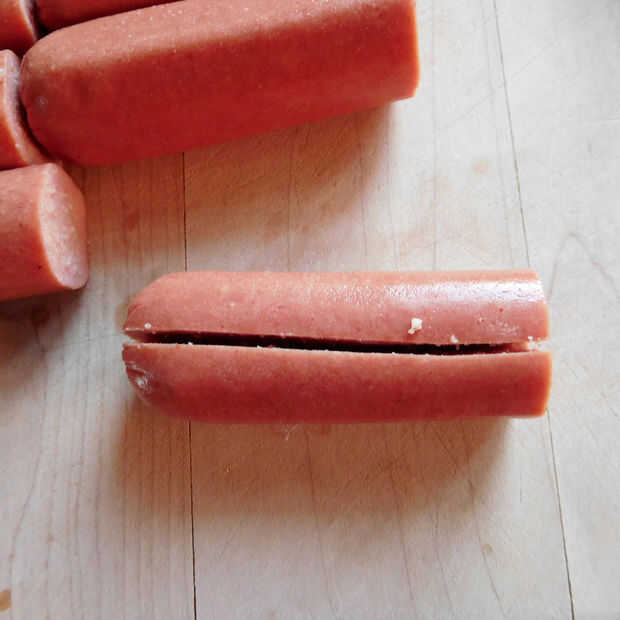 3. Cortar cada perrito caliente por el centro (longitudinalmente) teniendo cuidado de no cortar a través de todo el camino.