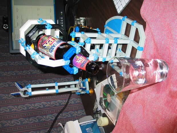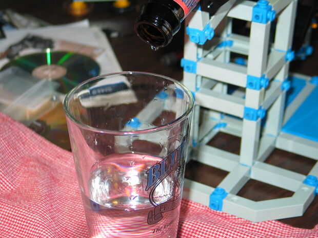 Bajo el peso de una botella de "agua" (no hay desperdicio de cerveza es mi credo) calibrar la posición y velocidad del servo. Seguir adelante y hacer un test de verter. He tenido algunas toallas de mano, porque la primera carrera lanzó agua por todo el escritorio.