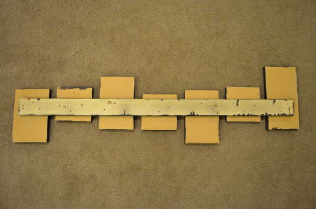 Para el 1 x 3 respaldo tablero, mina corté a 39". Usted necesitará tuyo más largo para acomodar los bloques de carta más amplia. Después de cortar sus bloques de letra, espacio ellos cómo quieres, luego ponen el 1 x 3 y marca de tiempo que desea. Cortan a la medida. No atornillar nada todavía. Vamos a pintar y pegar todo en la parte delantera primero antes de ponerlo todo junto.