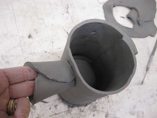 extensión slip (arcilla que se ha hecho líquida mediante la adición de agua, me refiero a él como pegamento de arcilla porque eso es lo que lo hace pega trozos de arcilla juntos) Deslice el borde angosto de la boquilla y coloque contra el cilindro de pote de té a 1 1/2 pulgadas hacia abajo desde la parte superior, justo enfrente de la costura posterior del cilindro.