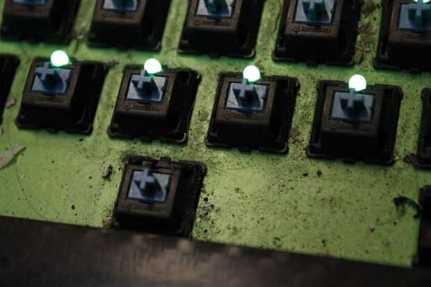 Usé el CRC limpiador para romper todos los escombros sueltos y luego frotó vigorosamente con mi pincel. Repita según sea necesario. Los desechos pequeños nada quiere decir cuando termina en la parte inferior del teclado. Yo generalmente desmontar toda la unidad una vez cada dos años.