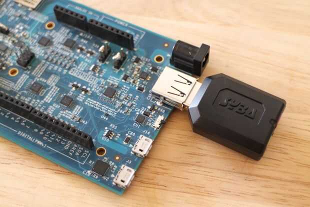 Vaya por delante y conectar la tarjeta de sonido en el puerto USB de tamaño estándar. Vuelta el mini interruptor hacia el puerto estándar y de los puertos del micro. Esto pone al Edison en modo host y ahora puede acceder a la tarjeta de sonido.