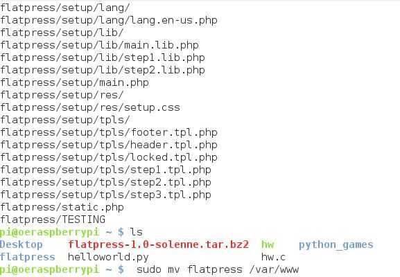 Si haces ls debería ver ahora el directorio de Flatpress. Linux Apache tiene un especial lugar donde se almacenan todas las páginas web. Si sólo íbamos a ejecutar un programa de web, puede almacenar los archivos en/var/www. Prefiero utilizar el directorio entero en su propio. Así que vamos a mover.