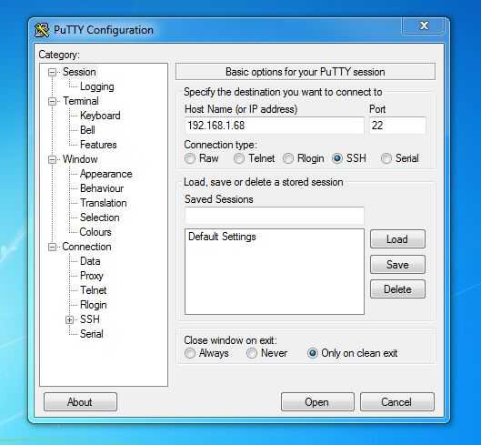 Bajo el nombre de host, agregue la IP IP has encontrado antes. Asegúrese de que está seleccionado SSH y el puerto es de 22.