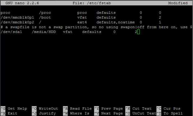 Bien la línea que acaba de agregar puede resultar un poco confusa por lo que voy a intentar explicarlo. La primera parte donde es dice/dev/sda1 es la es el nombre de la unidad de disco duro que desea agregar. Recuerde que el paso anterior. La siguiente parte es el lugar donde vas a montar. Luego tenemos el formato del disco duro. En este caso es fat32. Y finalmente el 0 y 2 en el final son los permisos.