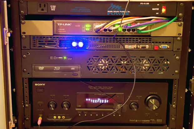 Tomé uno de esos viejos conmutadores de red puede en vez de comprar un nuevo caso de 1U y lo destruyó. Entonces tomé mi laptop antigua que contaba con una pantalla rota y montado dentro del interruptor y conectados algunos cables para que yo pudiera tener enchufes por ejemplo vga, sonido, de red en el exterior. Antes de esto nunca había utilizado linux, por lo que he instalado Ubuntu y Apache a menudo referencia a que la gente como ser el más fácil para los nuevos usuarios. Tuve mi amigo escribir un script en python para una página web con un botón que sólo tiene que conectar (y desconecte rápidamente) con el auricular bluetooth para abrir y cerrar la puerta del garaje con la idea de www.btmate.com. En ese sitio web, el autor toma un auricular bluetooth y el "beep" que se produce cuando el auricular está conectado y que utiliza para generar una señal para activar el abrepuertas de garaje. La página web también carga una imagen desde la cámara IP por lo que visualmente puedo decir si la puerta está abierta o no.