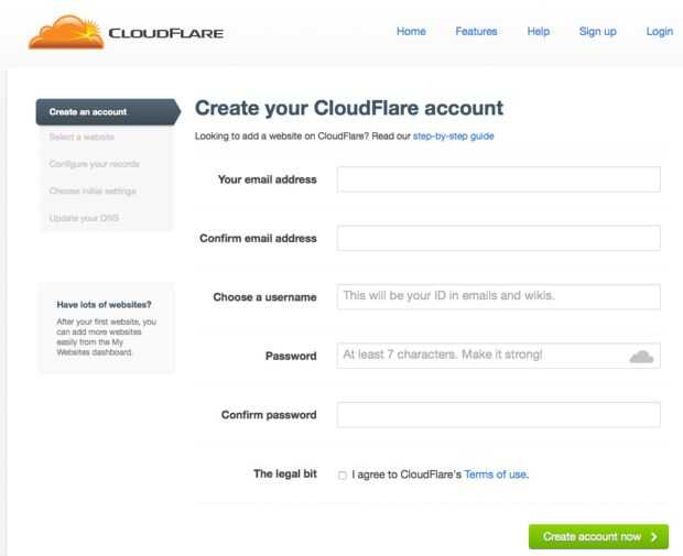 Puede visitar "http://www.cloudflare.com" y haga clic en el botón "Sign Up Now" gratis. Luego te llevará a la página anterior que le preguntará algunas preguntas simples por lo que puede configurar su cuenta de. Seguimiento de la ID de usuario y contraseña que creó para esta cuenta, ya que puede necesitar en el futuro a tunear cosas.