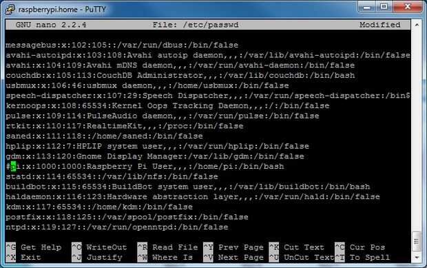Busque la línea "pi: x; 1000:1000:Raspberry Pi usuario,,,: hogar/pi: / bin/bash"y cambiarlo a"#pi: x; 1000:1000:Raspberry Pi usuario,,,: Inicio/pi: / bin/bash".