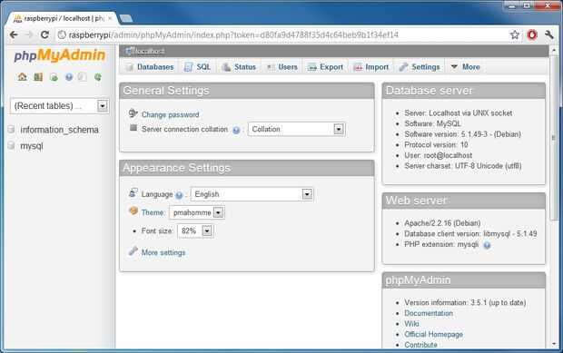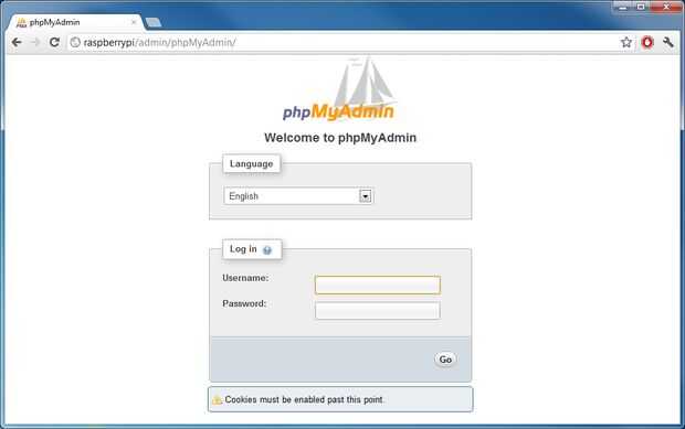 Ahora vaya a donde instalaste phpMyAdmin (para mí es http://raspberryPi/admin)