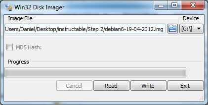 Una vez que ha descargado la anterior, a continuación extraer la imagen de Debian y la herramienta de proyección de imagen, ejecutar Win32DiskImager.