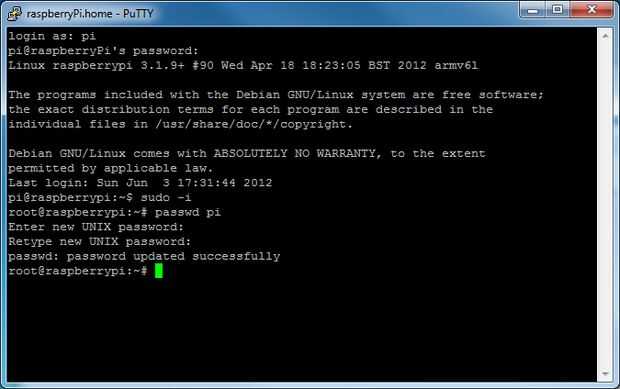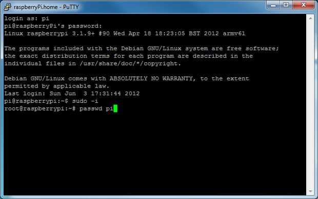 Para cambiar la contraseña por defecto, iniciar una sesión SSH (paso 5) e inicio de sesión, escriba "sudo -i", golpe volver / entrar, luego escriba "passwd pi" y pulse retorno (Enter).