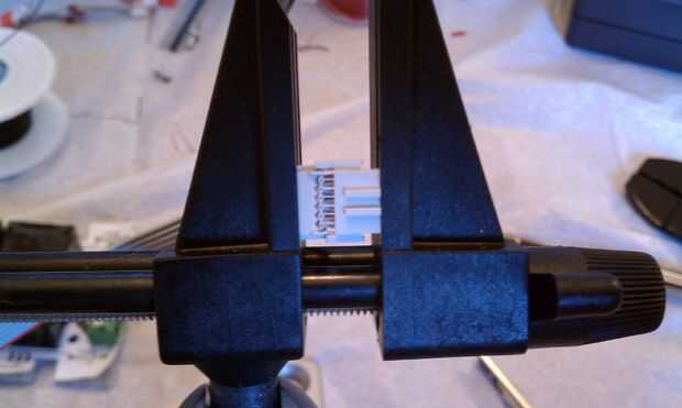 Coloque el cable de cinta del manguito y apriete cerrado con un tornillo de banco. Es posible prensar con las tenazas, pero también es muy fácil de arruinar la toma de esa manera. Si está disponible, un tornillo de banco es muy preferido.