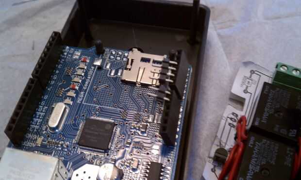 Si usas el recinto Arduino/Ethernet, encontrará que el caso no se cerrará, como el cable está en el camino. Doblar suavemente las patas más de 45 grados y luego venda las cabeceras un poco así. Esto permitirá que el caso para caber.