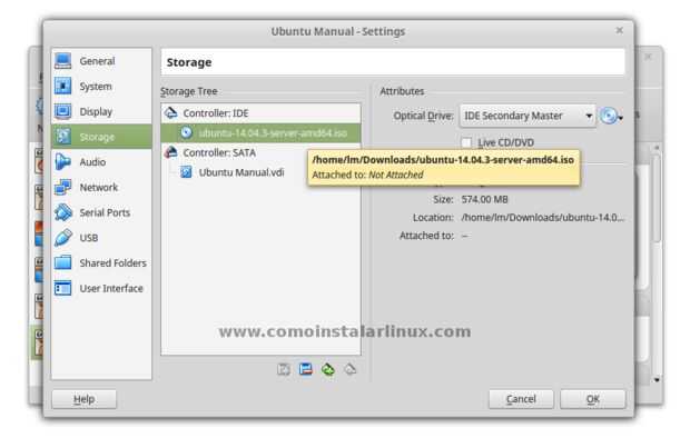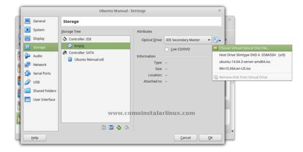 En el lado derecho, haga clic en el pequeño logo del CD, en el menú desplegable Seleccionar "Archivos de disco óptico Virtual eligió" y usted debe abrir el archivo ISO de Ubuntu descargar. (segunda imagen)