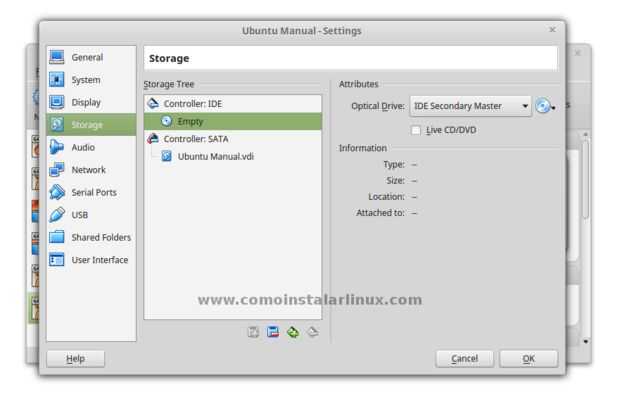 Para este paso usted tiene una máquina virtual recién creada para Ubuntu 64 bits con 1 o 2 GB de RAM y 20 GB de disco duro. Para montar el archivo ISO en CD/DVD de abrir la ventana de configuración de esta VM.