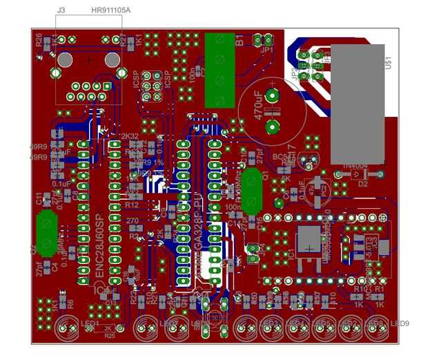 Como dije: el microcontrolador utilizado es el ATmega328 en DIP28 paquete. Se puede utilizar también la versión de baja potencia ATmega328P. Aquí se debe tener cuidado con las firmas del chip utilizadas por el programador de Arduino - para ambos chips difieren. Cómo resolver el problema se puede ver aquí. El chip ETH es ENC28J60 en paquete de la inmersión. En el PCB hay lugar donde un relé Zettler AZ733-2 C-12DE puede soldarse, pero es opcional. La parte más exótica en todo el diseño es la clavija Ethernet con imanes integrados "HanRun" HR911105A. Los dispositivos pasivos son principalmente SMD. Esto podría ser problema para personas que no tienen experiencia con soldadura de estos dispositivos, pero en este sitio se puede encontrar un montón de instrucciones acerca de esto.