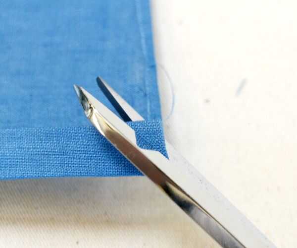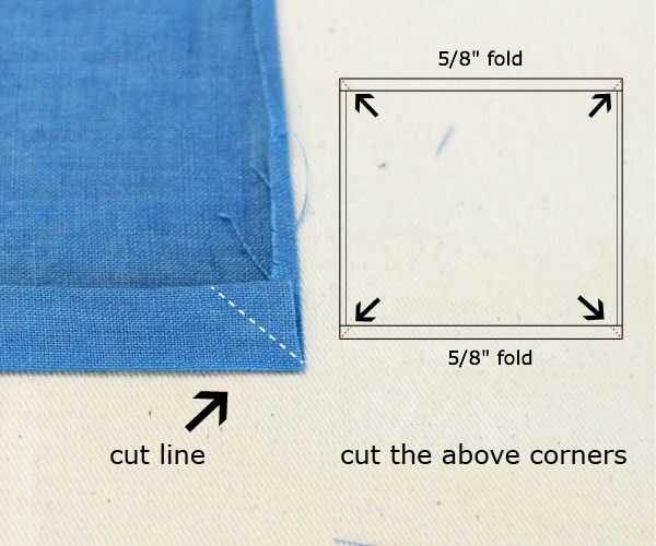 Toma tus tijeras de tela y recortar las cuatro esquinas de los dos 5/8 dobleces como se muestra en las imágenes de arriba.