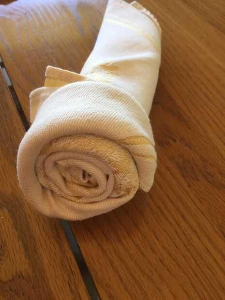 Inicio en el extremo del triángulo y enróllelo en el otro extremo. Debe buscar una roseta en un extremo de la servilleta. Remeter el extremo en otra sección del rollo.