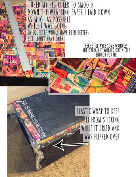 Me alisó todo abajo y pegado a los bordes hacia abajo, tipo de plegado el papel como el papel (que lo era!) y metiendo el bajo. Luego aplica una capa delgada de pegamento en la parte superior y volcó la parte superior para terminar en el otro lado. Asegura los bordes de este lado, entonces utiliza más servilletas para solapar la envoltura de papel los bordes para que se vea más ordenado.
