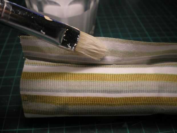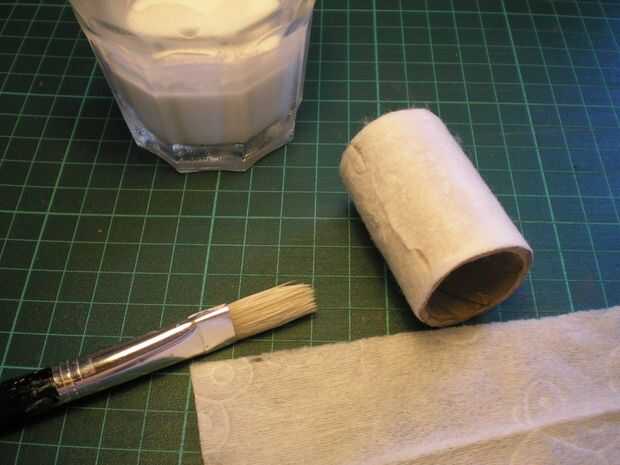 Cola de de Prepárate una mezcla con dos partes blanca con una de agua. Encola la tela en el exterior del tubo de cartón, cortando si sobra. Déjalo secar unos minutos y luego encola la tela, ahora dejando cierto solapamiento.