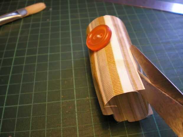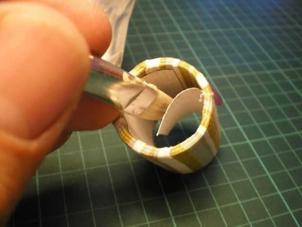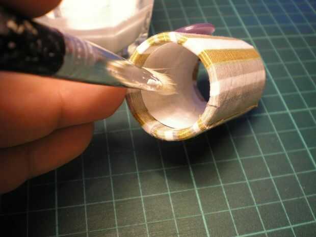 Haz varios cortes en la tela sobresale para ayudar a doblarla, y encólala en la parte interior del tubo de cartón. Déjalo secar unos minutos y a continuación encola el papel (o la cinta) cubriendo la tela por dentro. Déjalo secar de nuevo, y para finalizar aplica cola por dentro para hacerlo más resistente.