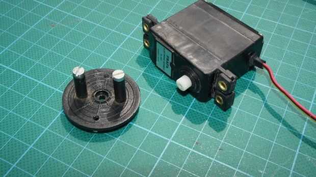 Tuve un servo estándar a la izquierda de un avión RC y por lo tanto modificar en un modelo de rotación continuado. Ya que esta modificación está muy extendida en Internet yo no describir aquí. Logró con el procedimiento indicado en el libro "Hacer: Arduino robots y Gadgets", página 207.