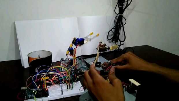 Voy a intentar mostrar cómo se puede controlar 4nos. Torre Pro servo 9g dispuestos como un brazo robótico, que tendrá 4 DOF, puede controlar este brazo robótico con 4 sistema de paralelo de potenciómetro arregló con nuestro brazo robótico, brazo robótico moverse, actuar y seguir el movimiento del potenciómetro, puede recoger y colocar objetos pequeños con la ayuda de griper minúsculo en el extremo del brazo.