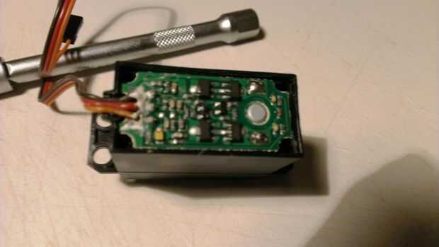 Hay un PCB dentro de la caja, que tiene el motor, un potenciómetro, así como toda la electrónica adjunta. Utilice un destornillador plano a suavemente la capa del PCB hacia fuera. Esto puede requerir alguna fuerza, como puede o no puede pegar. Sólo asegúrese de aplicar la fuerza uniformemente para no dañar el PCB. También se puede conectar el potenciómetro a uno de los engranajes. Si absolutamente no quiere salir, retire la tapa y los engranajes así y compruebe si hay algo puedes hacerlo desde el otro lado para ayudar en el proceso.