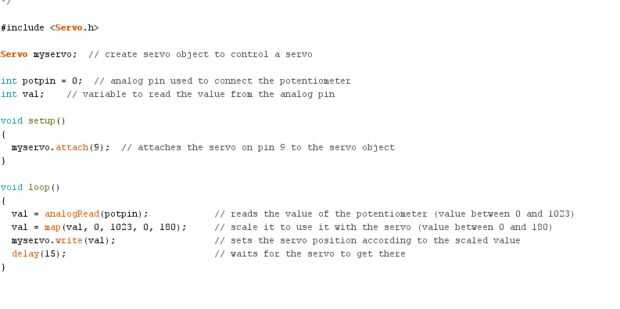 void loop() {val = analogRead(potpin); / / lee el valor del potenciómetro (valor entre 0 y 1023) val = mapa (val, 0, 1023, 0, 180); / / escala que utilice con el myservo.write(val) servo (valor entre 0 y 180); / / establece la posición del servo según la escala de valor delay(15); / / espera a que el servo llegar}