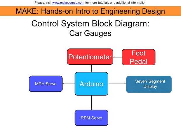 Tan el el funcionamiento de los medidores son que el calibrador mph recibe entrada de potenciómetro a través del arduino y el calibre de mph se asigna directamente de esa entrada. Entonces el indicador de rpm utiliza una función para leer los valores del indicador mph para asignar sus propios valores. La gama de mph se divide en cinco secciones o engranajes, y el medidor de rpm va a responder en consecuencia, dependiendo de que equipo es. La exhibición de siete segmento luego lee los valores del indicador mph y muestra la velocidad actual. Por encima es un diagrama del sistema de control que modula los indicadores y que es el código que usé. El multiplicador en la variable de cambio RPM es por lo que la aguja comienza un poco más alta en cada marcha sucesivos, como en un coche real.
