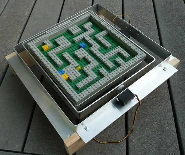 Esta es la versión del laberinto de mármol clásico (hay opciones en el camino), donde el pan y tilt están controlados por servos de hobby. Con los servos, se puede trabajar el laberinto con un controlador RC o un PC, etc..
