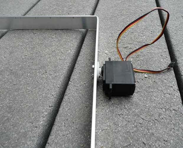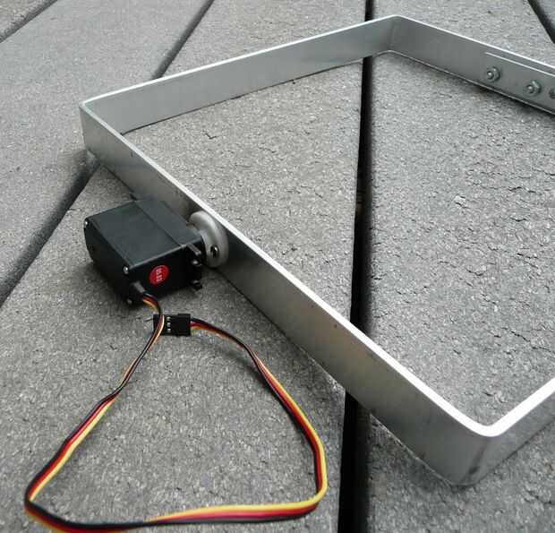En el lado opuesto, colocamos un cuerno del servo. Hemos perforado un orificio grande para el reborde de plástico alrededor del centro (en el otro lado de donde el servo se conecta), a continuación, utiliza un par tornillos de #6 para montar el cuerno del servo. la corneta se monta en el exterior del anillo. El gran agujero en el centro permite el tornillo de ajuste de servo a apretarse desde el interior.