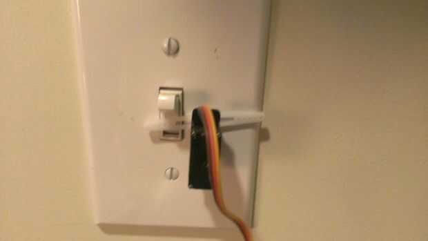 Así que, ¿cómo exactamente se este servo mágicamente encender y apagar nuestro lightswitch? Bien, en el espíritu de mantener este "cliente-amistoso", simplemente usaremos un pequeño clavo para fijar a la placa de lightswitch. Placa es relativamente barata de reemplazar, y he encontrado que un clavo estructura funciona mejor para conectar el servo para cambiar la placa para evitar que se mueva un sentido inverso.