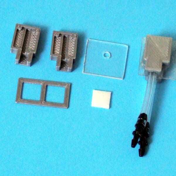 La válvula de retención permite aire o líquido flujo unidireccional solamente. Consta de dos partes impresas vivienda 3d que se pegan junto con una pieza delgada de acrílico entre ellos. El acrílico tiene un orificio de 1/16 de pulgada perforado en él. Una membrana de fundición fina de silicona se coloca libremente entre el acrílico y una de las partes de la vivienda. La silicona se proyecta utilizando el formulario impreso junto con las piezas de dos viviendas de 3d. Dos parte silicona o Oogoo puede ser utilizado para hacer la membrana.