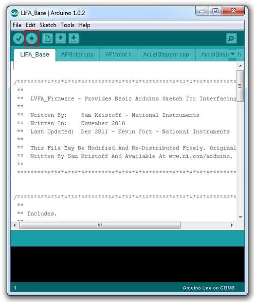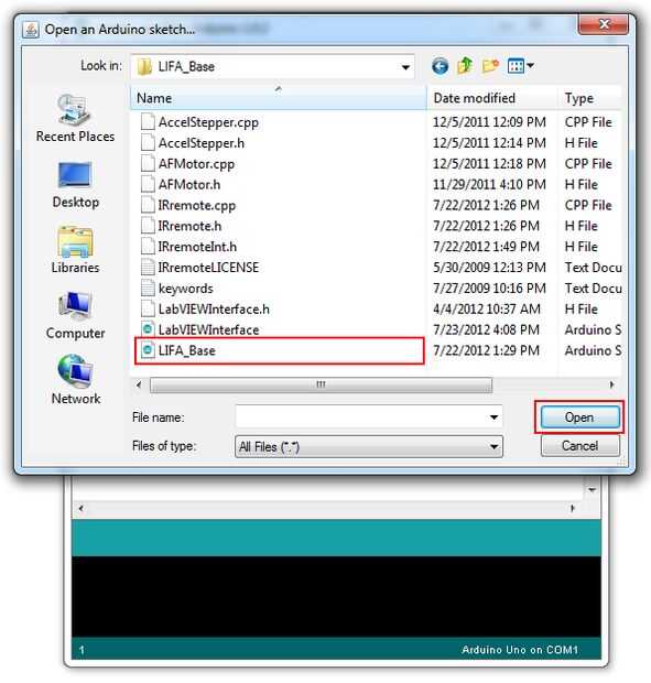 Vaya a \vi.lib\LabVIEW interfaz para Arduino\Firmware\LIFA_Base donde es el directorio LabVIEW (c:\Program Files\National Instruments\LabVIEW 20XX por defecto). 3. Seleccione LIFA_Base.